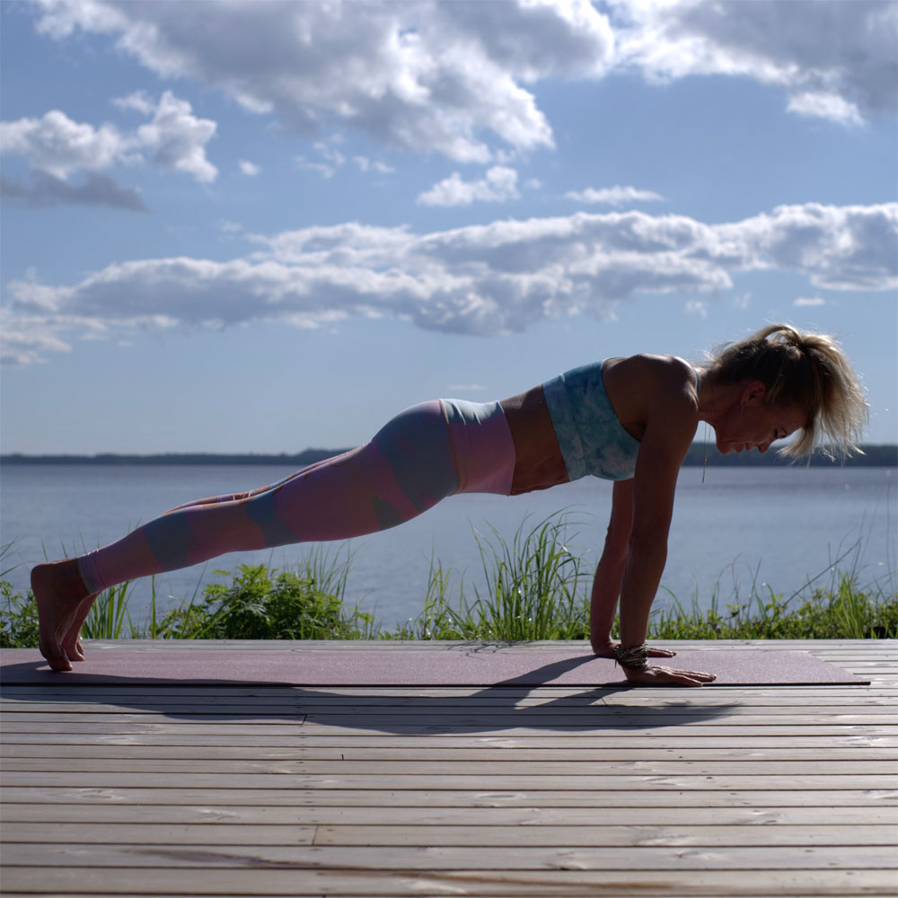 바닥에 엎드린 자세에서 두 손을 어깨너비로 벌려 바닥을 집고 서서히 몸을 일으킵니다. 이때 상체만 일어나서는 안 되고 몸이 전체적으로 일직선이 되도록 일으켜야 합니다.